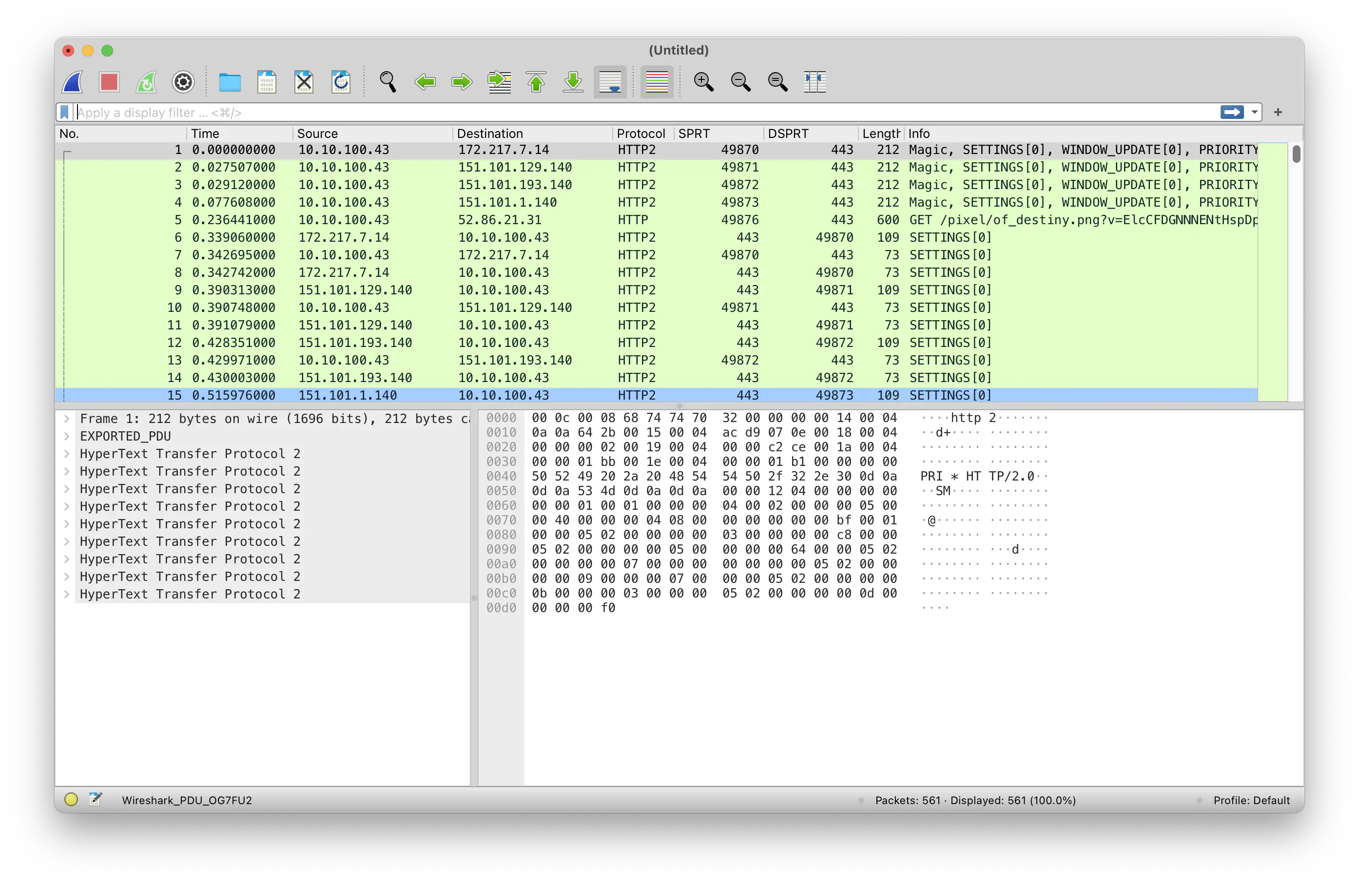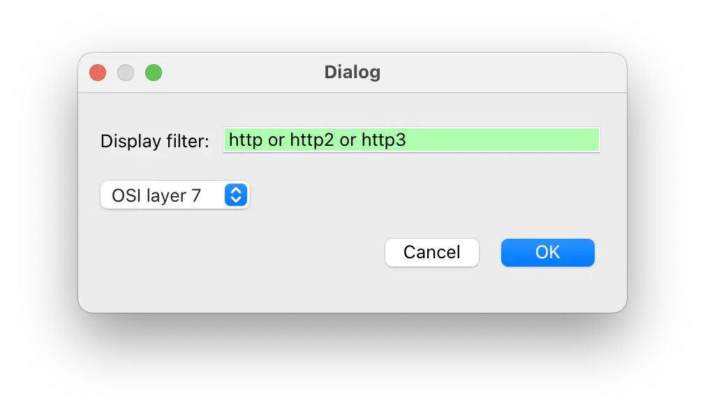 Use the “Export PDUs to File⦔ to strip away all L1-L6 information. Here, you can filter packets by HTTP, HTTP 2, and HTTP 3: