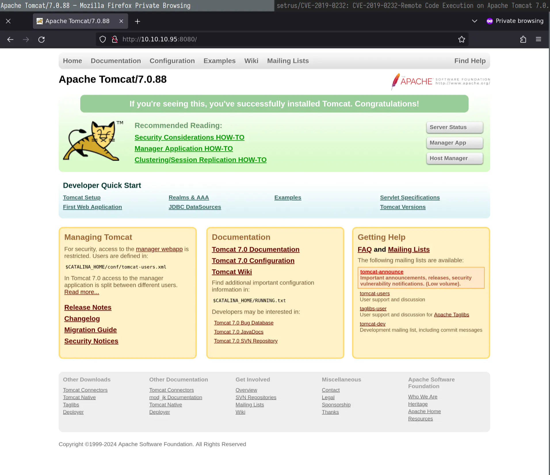 Landing page of this machine’s Apache Tomcat instance Open in new tab (full image size 117 KiB)
